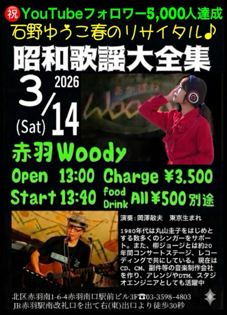 次回の石野ゆうこライブは2026.3.14(土)「赤羽Woody(ウッディ)」にて13:00〜行います。お申し込みは直接メールにてお願い致します。🥰チケット完売致しました。キャンセル待ちご希望の方はその旨記載の上、直接メールを頂ければこちらからご案内させていただきます。よろしくお願い致します。🤗