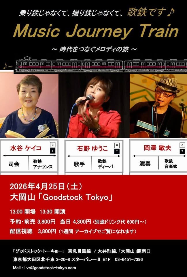 歌鉄必見!2026年4月25日(土)13:00〜大岡山のGoodstock Tokyoさんで、電車内録音放送でも有名な水谷ケイコさんの甘い語りに乗せて、石野ゆうこが歌います。何が飛び出すか?どうぞお楽しみに!